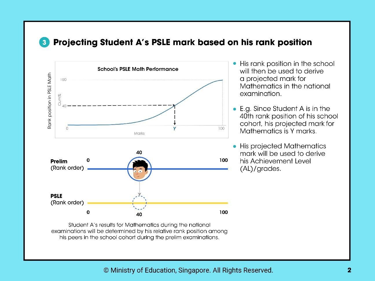 4. Using an example of a candidate who had missed his/her PSLE Mathematics examinations due to valid reasons, SEAB will take into consideration the candidate’s school preliminary examination results for Mathematics to determine his/her relative rank position among the peers in the school cohort. This relative rank position will then be used to derive the candidate’s projected mark for PSLE Mathematics from the school cohort’s performance in the PSLE based on the mark that corresponds to this relative rank position. The candidate’s projected PSLE Mathematics mark will be used to derive his/her Achievement Level (AL).